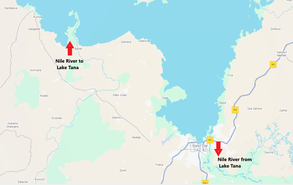 The Blue Nile originates from Gish Abay, Sekela in West Gojjam Zone, and runs to Lake Tana’s southwest corner, then runs from Lake Tana’s southeast corner, and flowing south over a lava dam to form the Tis Abay Falls. The Blue Nile contributes two thirds of all the Nile discharge, and covers about 4750 kilometers through Egypt and to the Mediterranean.